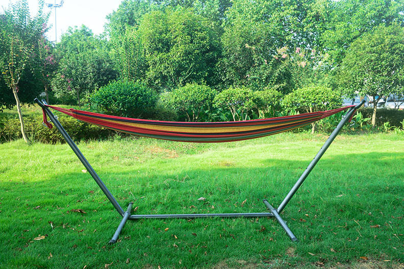 Enjoy the outdoors in style and comfort with the colourful Hammock & Stand Combo. This item is a useful and comfortable addition to balconies, decks, backyards and more. Take this hammock with stand combo camping or to the beach to create a comfy spot for relaxation when you're outdoors. It features a space-saving design that fits easily in compact spaces, such as small patios. The strong frame is constructed of sturdy and durable heavy-duty steel and has an attractive charcoal finish.