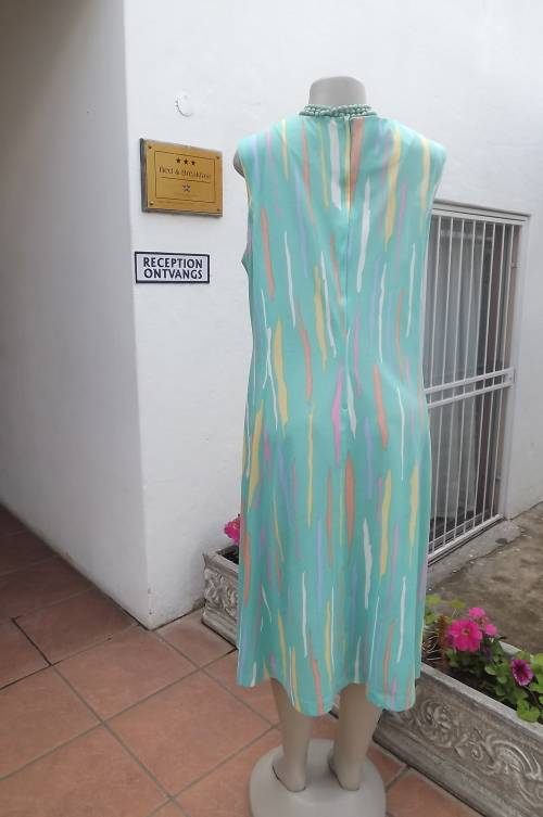 Fabulous 2 piece dress and jacket outfit in size 44/20.Dress in A line style.Loose fit.Bust 120cm. In light polyester with colourful patches V front.Short matching jacket by RIALTO. Very good condition