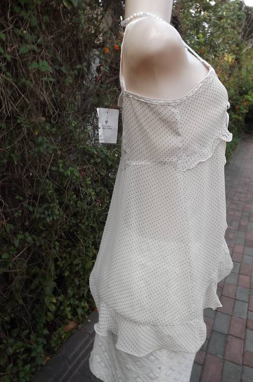 Fabulous cream top with tiny black polkadots. Lace shoulder straps and decoration.Size 38/14 by Pastel Ma'am.In sheer polyester with lots of frills on front.Suitable for day or evening. New item.Never used.f