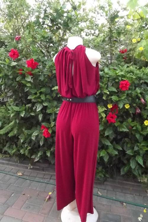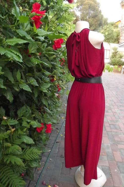 Fabulous Dark Red Jumpsuit for Evening or Day Wear in stretch fabric in size 12/36 - high neckline that ties at back - pleated front and back bodice - new condition - belt included