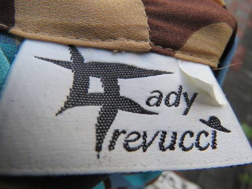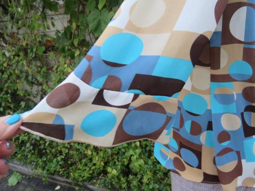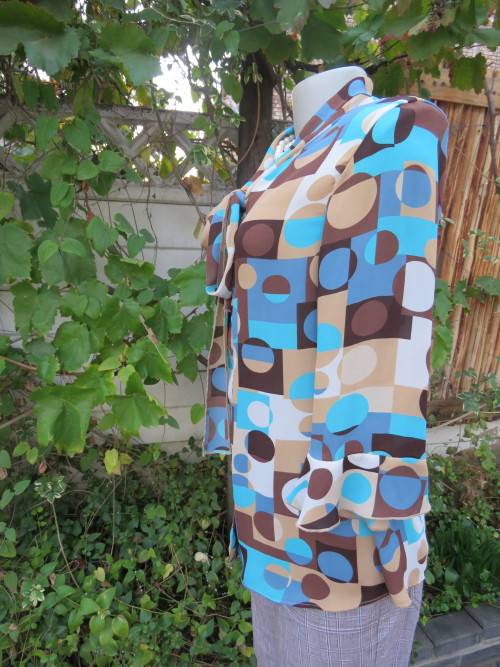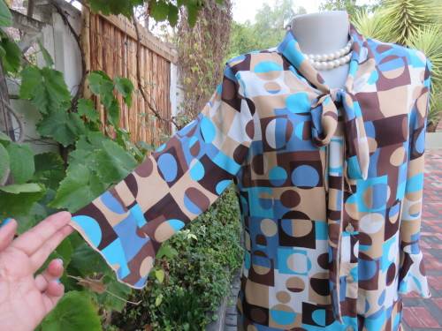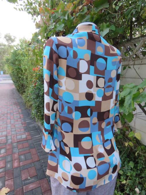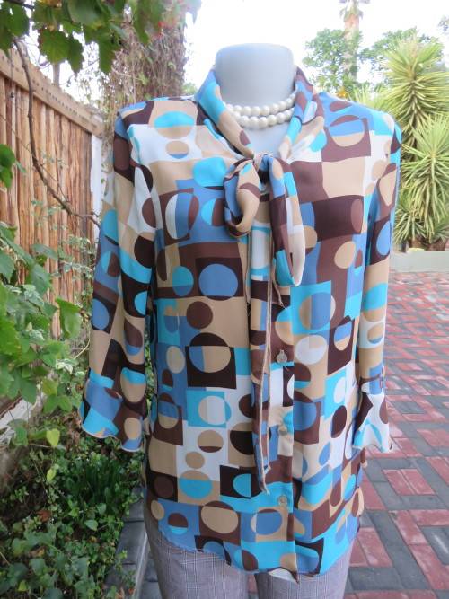 Fabulous 100% polyester top in beige,blue and brown circles and squares.Size 34/10.Button down front and tie collar.Bracelet sleeves with flare cuffs.As new. By LADY TREVUCCI.