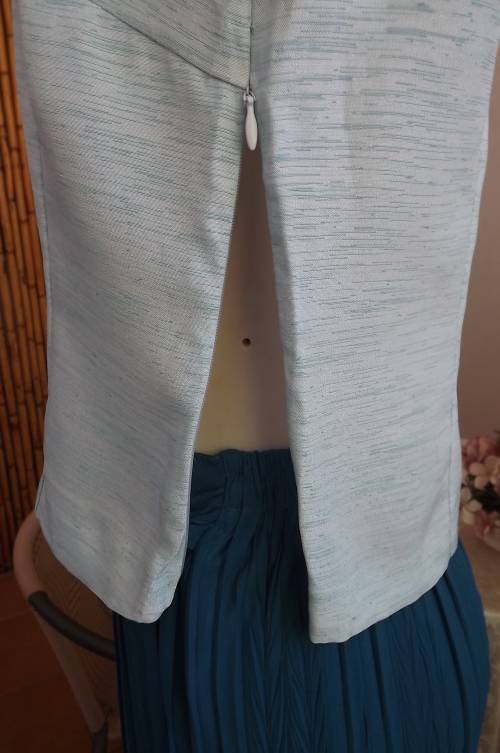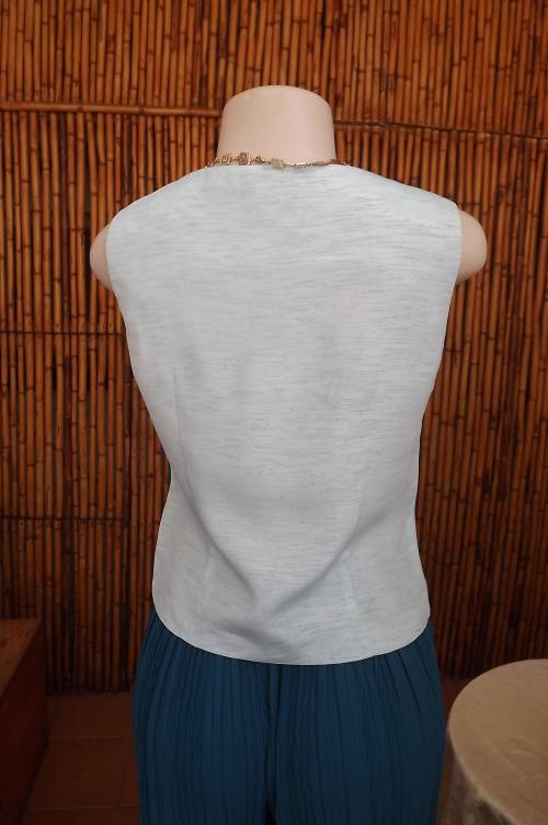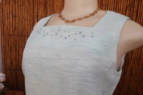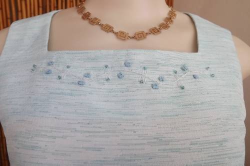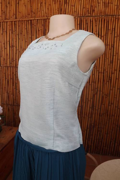 Fabulous light turquoise satin sleeveless top with square neckline.By Blancafe in size 34/10.Embroidery on front.Suitable for day or formal wear.Zip at side.New condition.