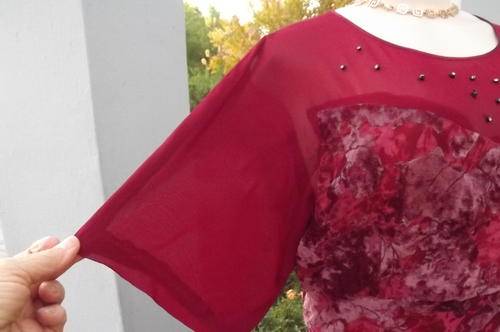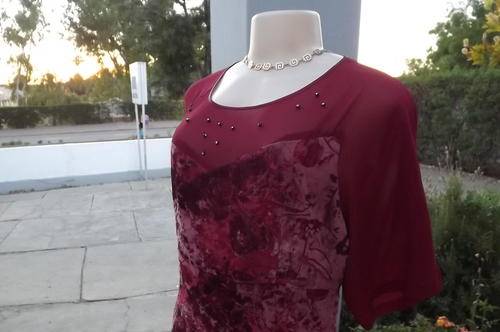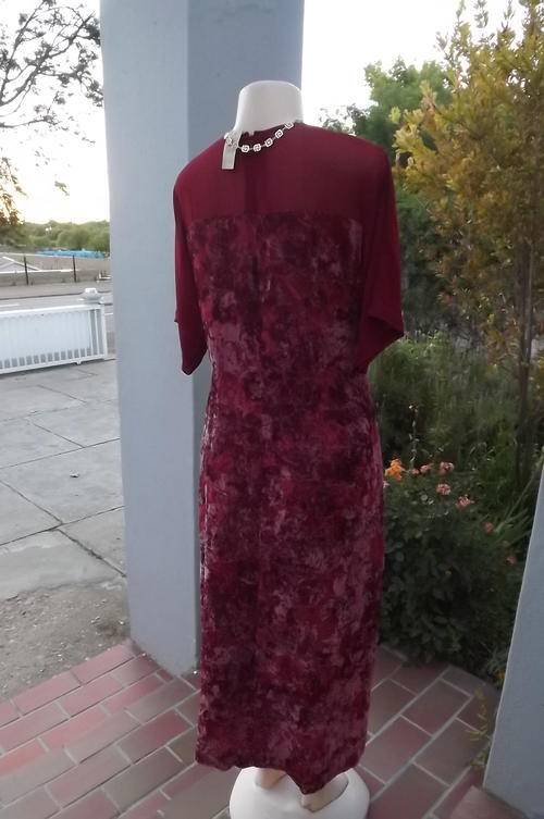 Fabulous maroon colour dress for special occasion. Size 40/16. See-through shoulders and sleeves are an extension of the lining. Top layer is sheer fabric with velvet pattern. Embellishment on front. Empire style. Good condition