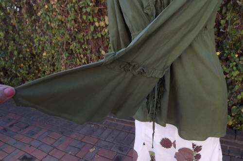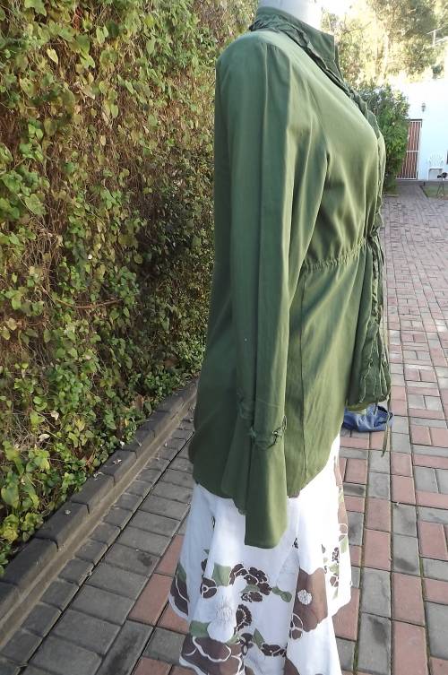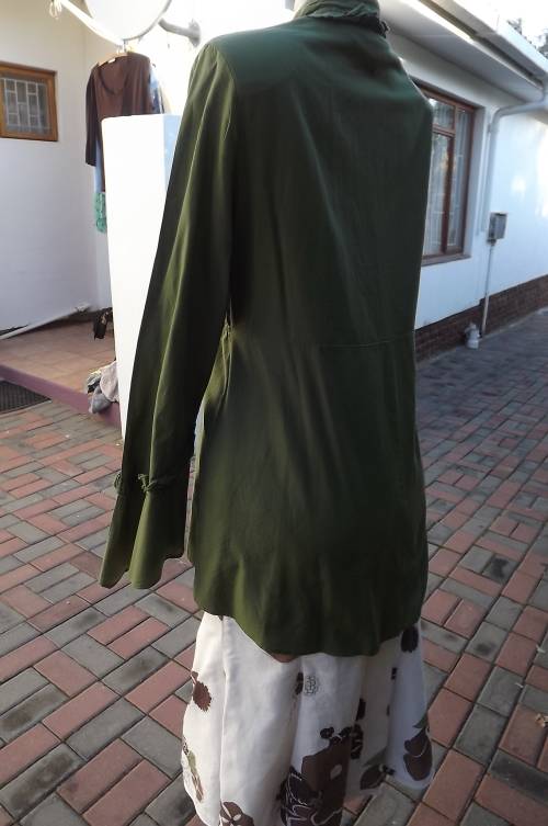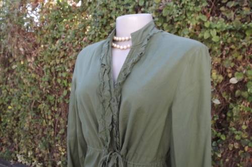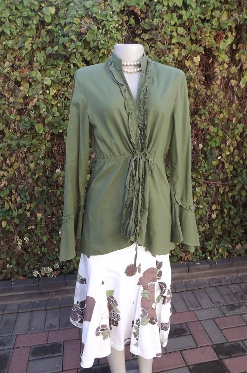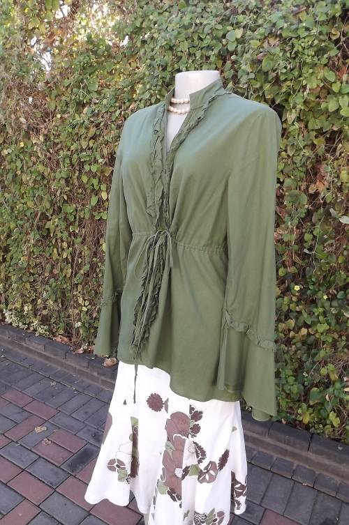 Fabulous olivegreen 100% cotton blouse by WOOLWORTHS in size 38/14.Button down front with frills both sides.High banded collar with v neckline.Long sleeves with flare angle cuffs.Tiestring in middle front.Top lower on front than back.Good condition.