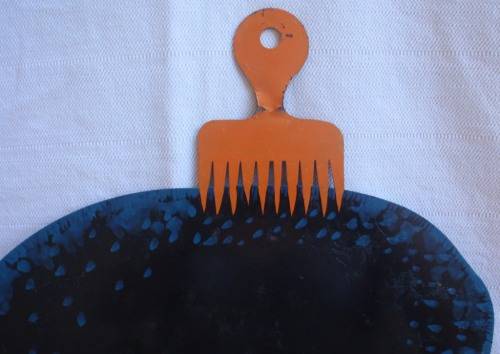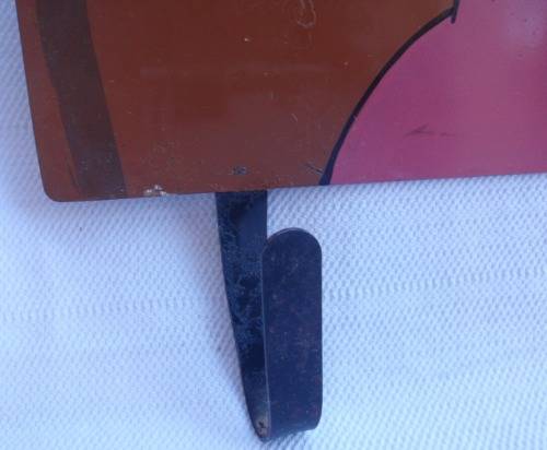 UNIQUE & QUIRKY - MADE FROM A SOLID FLAT PIECE OF METAL (FROM THE ORANGE COMB TO THE HOOKS) HAND PAINTED AND GORGEOUS! PLEASE NOTE THAT THIS ITEM IS VINTAGE AND HAS RUST IN SEVERAL PLACES - BUT GENERALLY IT LOOKS GOOD. (SOME AREAS THE PAINT IS A BIT BUBBLED WHERE THE RUST IS STARTING) SIZE: HEIGHT FROM COMB TO BOTTOM OF HOOKS 58CM X WIDTH AT SHOULDERS 45CM.