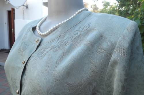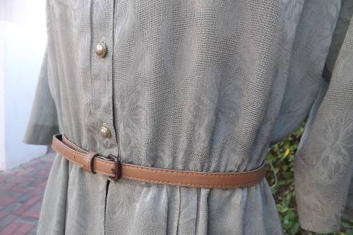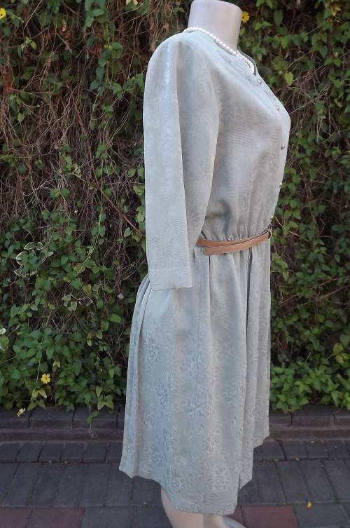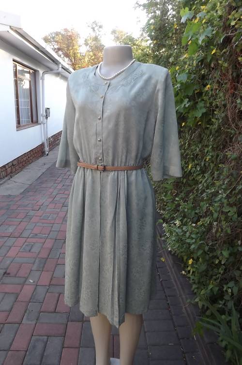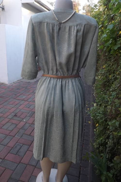 Fabulous vintage dress in bluegrey with tiny pattern.Size 36/12.Permanent pleated skirt.Short flare sleeves.Elasticated middle.Frilled neckline.Button down front.Short zip on front.In 100% wash + wear polyester.Skirt lined.Made in Korea.very good condition.Belt included.
