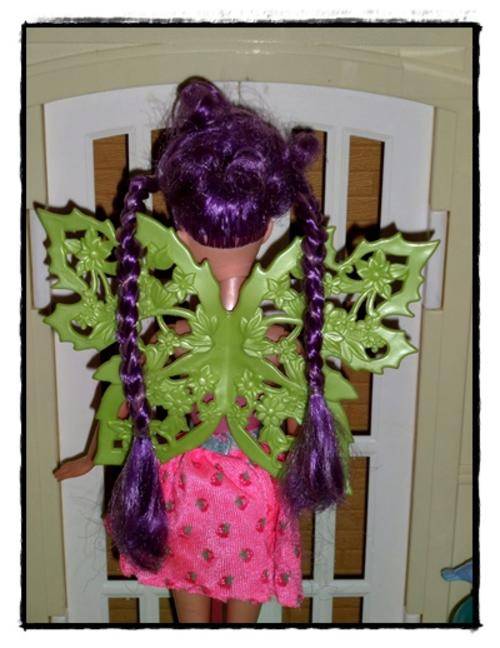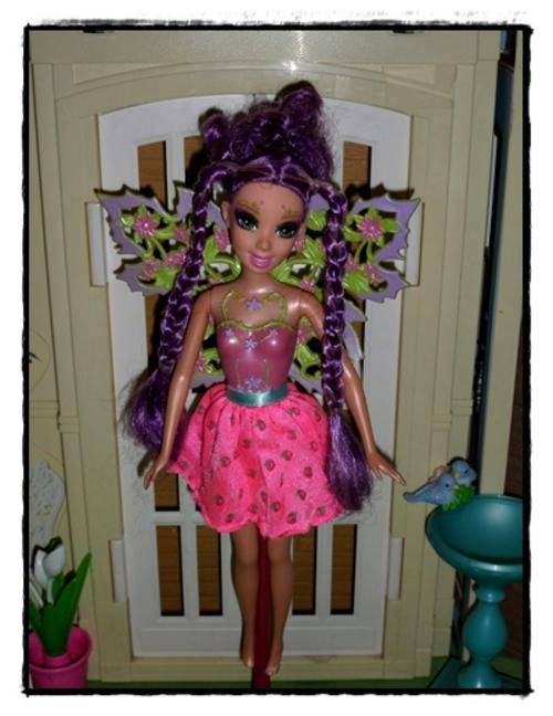 Up for auction is a beautiful Fairytopia Purple Fairy Barbie doll and she is made by Mattel. She is wearing a cute strawberry skirt (not her original though) as well as her gorgeous, detailed wings, but unfortunately no shoes. She has a beautiful and unique face with flower 'tattoos' above both eyes: pink lips, green eyes. She has a petite bellybutton bodyshape, ballerina arms, pointy ears and bendable legs, which is covered in pink shimmer. Her blue hair is tied in its original style. She is a beautiful addition for your fairy collection, but please take note that her left foot has minor pressure marks for being nibbled on. Sorry, but no extra clothing or accessories are included. Check out my other listings - you just might find the doll you're looking for! Contact me with any questions you have regarding this doll.