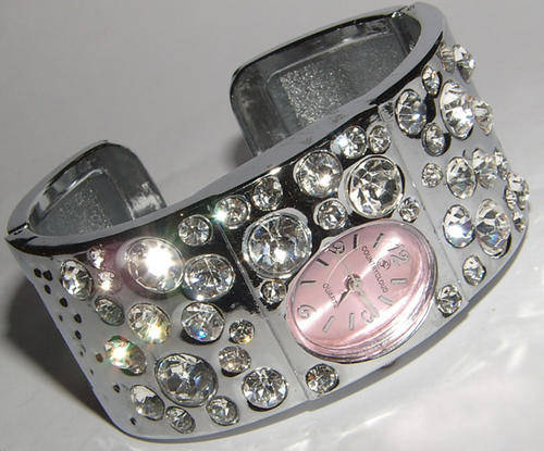 SWEET PINK METALLIC FACE SILVER HANDS AND MARKERS FANCY BEZEL WITH WHITE AUSTRIAN CRYSTALS MODERN HINGED BAND EMBEDDED WITH WHITE AUSTRIAN CRYSTALS