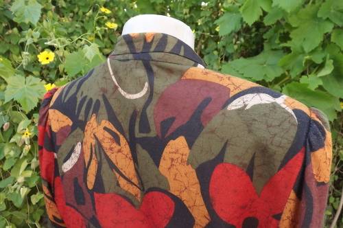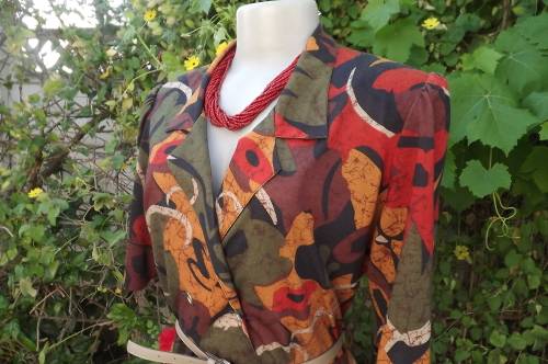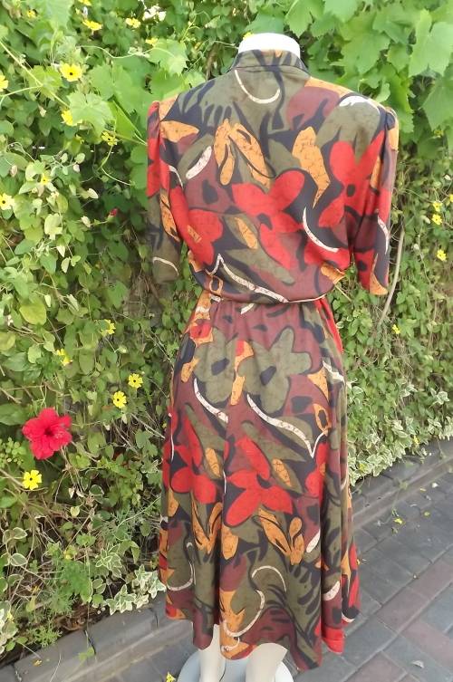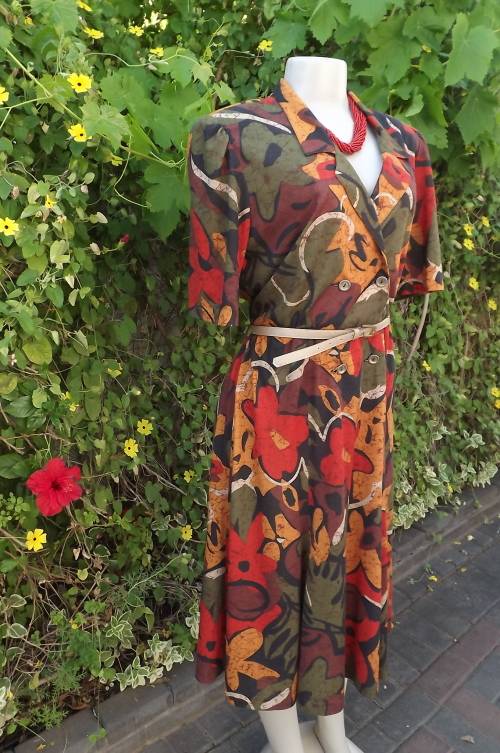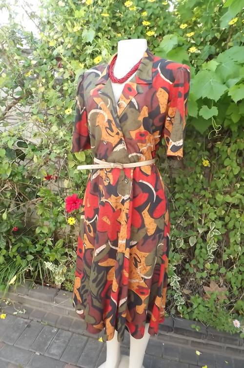 Fantastic autumn colour vintage dress in bold print by MANHATTAN size 34/10.In polycotton with stretch.Double breasted top with open collar. Panelled wide A line skirt.Short sleeves with shoulder pads.Belt included. Used but in good condition.