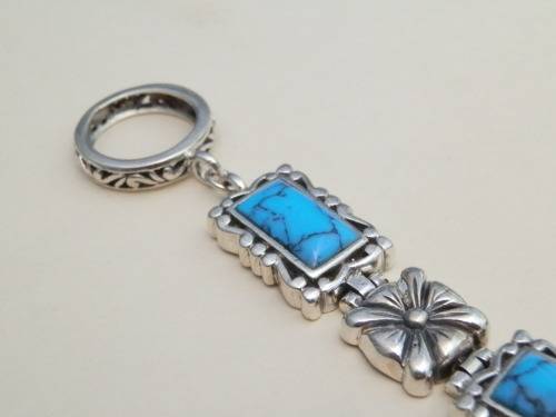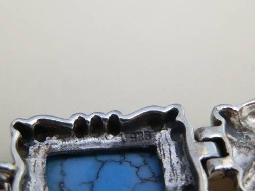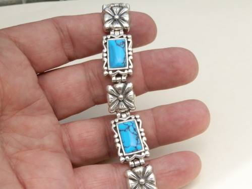 Fabulous sterling silver turquoise bracelet, marked 925 and in good as new condition. The length is 19 cm, the width approx 13 mm and the weight a whopping 33.7 g. Very nice!!