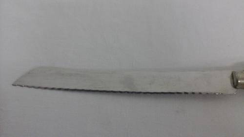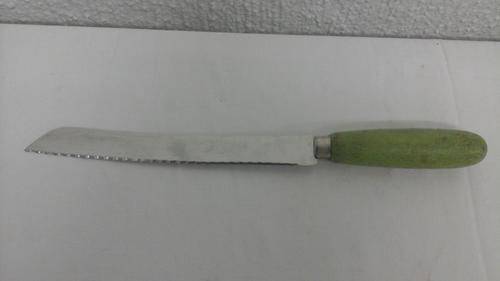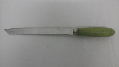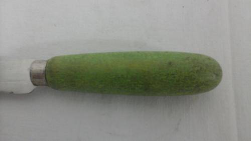 FANTASTIC VINTAGE CURZON SERRATED KNIFE. MADE IN ENGLAND. STAINLESS STEEL SERRATED BLADE. HAS A CHIPPY WOOD GREEN HANDLE.THE HANDLE IS A BIT DISCOLRED BUT OTHERWISE GOOD CONIDITION AND THE BLADE IS STILL SHARP. IT HAS "STAINLES STEEL CURZON MADE IN ENGLAND" FAINLTY ENGRAVED ON THE BLADE. IF YOU HOLD THE BLADE AT AN ANGLE YOU CAN SEE IT. IT MEASURES APPROXIMATELY 295 MM LONG. AWESOME USEABLE PIECE!