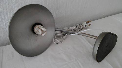 FANTASTIC VINTAGE DESK LAMP. MADE OF STEEL. WORKING CONDITION! LOOKS WORN FROM AGE. THE LAMP BASE IS 210 MM X 115 MM, ITS SHAPE IS 250 MM ACROSS AND ITS ARM IS 360 MM LONG.