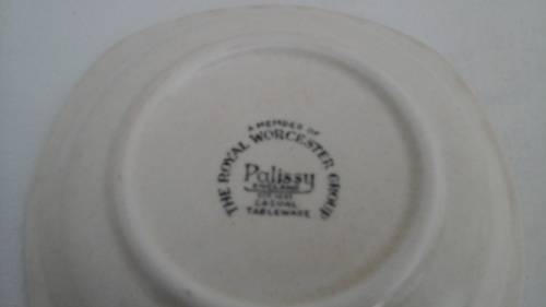 ON THE BOTTOM IT HAS "A MEMBER OF THE ROYAL WORCESTER GROUP PALLISY ENGLAND EST 1853 CAUSUAL TABLEWARE" STAMPED.