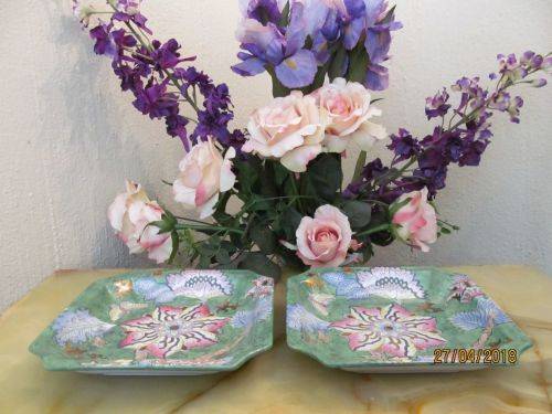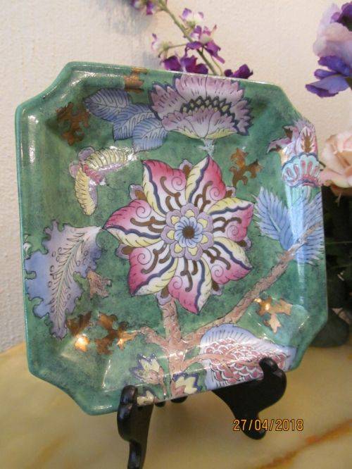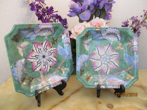 A MOTTLED GREEN ENAMEL BACKGROUND DISPLAYS AMAZING PINKS, GENTLE BLUES, PURPLES AND SUN YELLOWS WITH BROWNS ALL WITH RICH GOLD ACCENTS PORTRAYING A FANTASTICAL FLORAL PATTERN WITH A BUTTERFLY NEAR THE CENTER FLOWER. EACH OF THESE AMAZING DISHES IS A REMARKABLE DISPLAY DISH