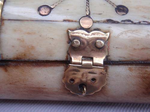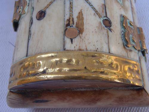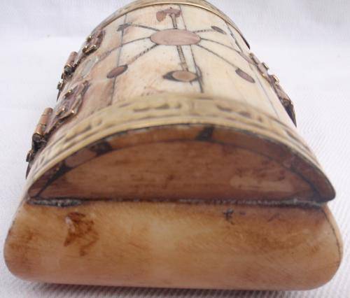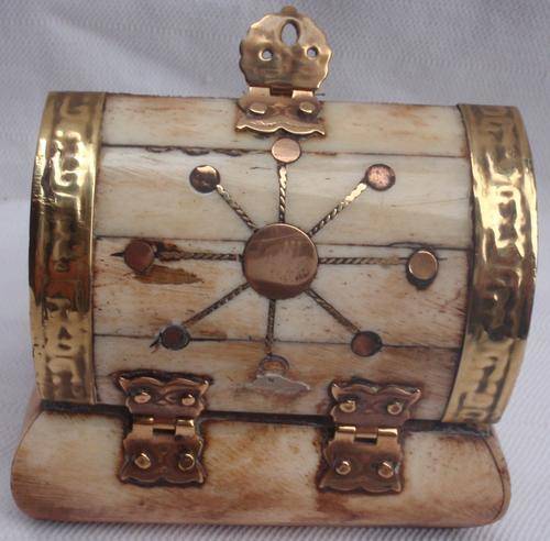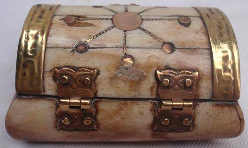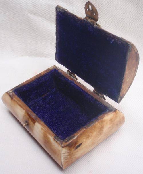 FASCINATING - HANDMADE IN THE MIDDLE EAST. LAMINATED BONE WITH INLAID BRASS DESIGN. LOVELY LITTLE LOCK & HINGES THAT ARE IN WORKING ORDER. LINED WITH MIDNIGHT BLUE VELVET. SIZE: Length 9cm x Width 7cm x Height 5cm.