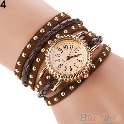 Features: Golden Round Case, Multilayer Faux Leather Band, Punk Rivet Style