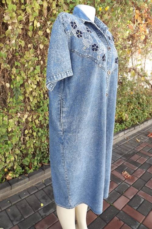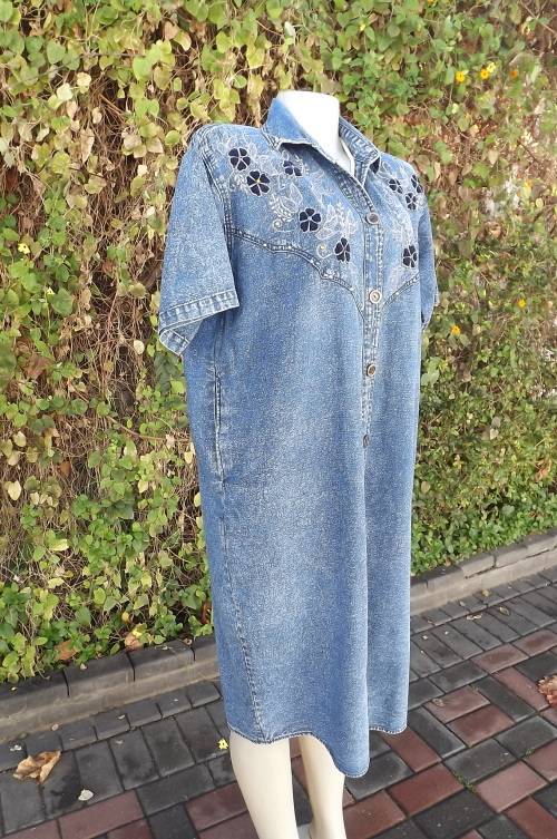 Fashionable blue denim dress in wedge style.Size 40/16 by OPVJV.Embellished front and collar