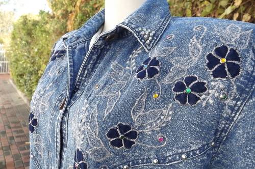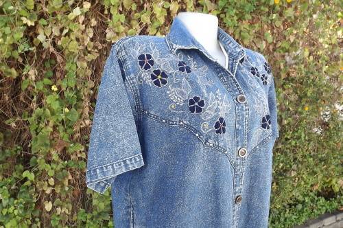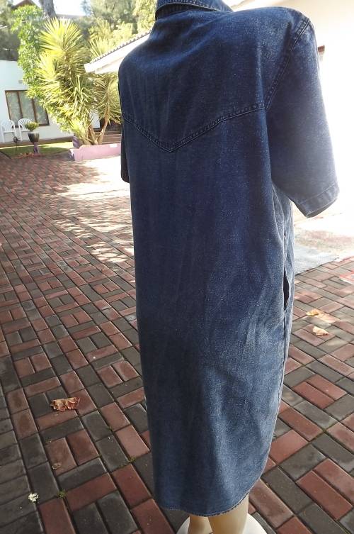 Fashionable blue denim dress in wedge style.Size 40/16 by OPVJV.Embellished front and collar.Button down front.Yoked back and front.Pockets at sides.As new
