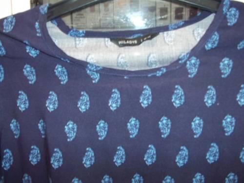 I have worn this top about twice. To the delight of my hubby I am finally putting on some weight. The size is 10/34. The material is 100% Rayon. So, it is extremely easy to care for. There are no marks whatsoever on this garment. It looks brand new. My apologies for the poor picture quality.