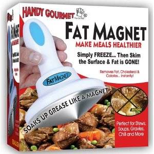 Fat magnet absorbs fat so you don’t. Instantly reduce calories, lower cholesterol and create healthier meals by removing and absorbing excess fat that floats on the surface of foods. Just freeze, skim the surface and fat is gone! Use in soups, gravies, stews, chili and other liquids.