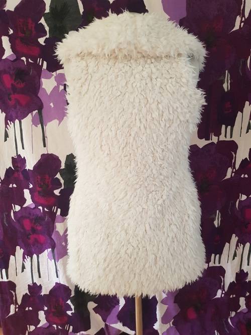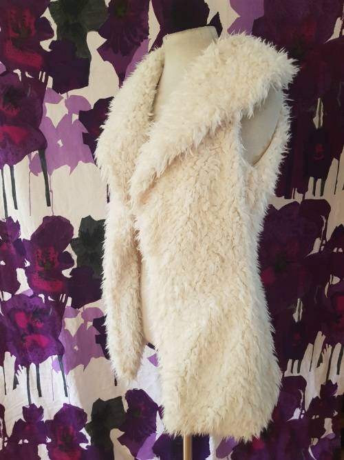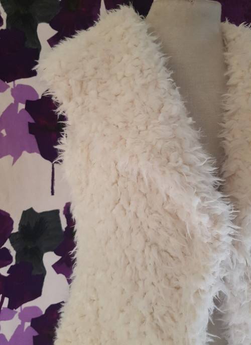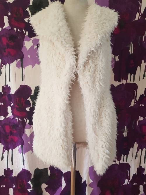 Ladies Faux Fur Gilet (Sleeveless Jacket) in an off-white colour. It has pockets on both sides. It is worn in an open style.