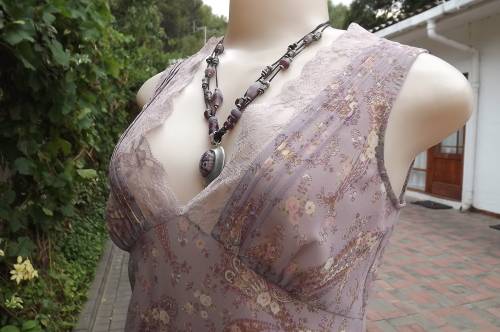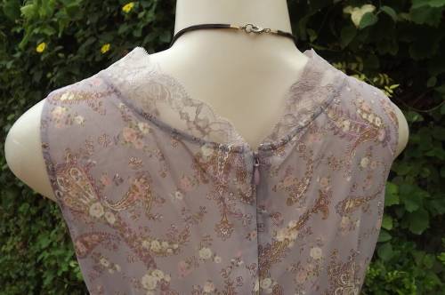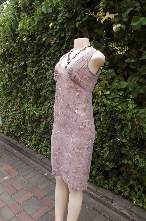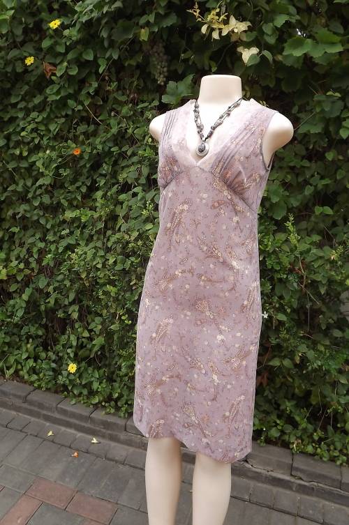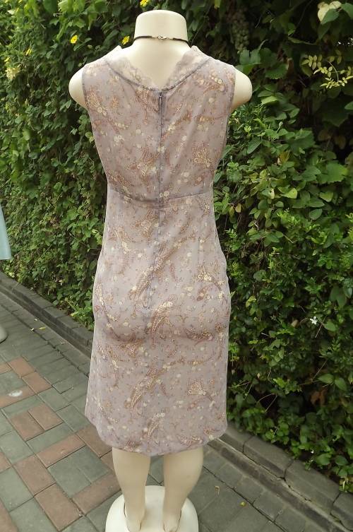 Feminine dusty pink sheer polyester dress with floral and paisley pattern.Size 33/9 by IMAGE.Pleats on bust area with lace decoration around neckline.Long disquised zip at back.New condition.