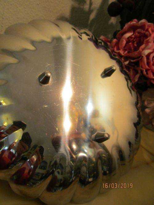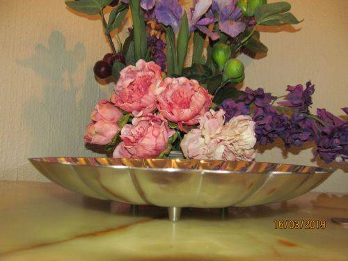 THIS ITEM IS A SCALLOPED RIM DISPLAY DISH WITH PROMINENTLY VISIBLE FLUTED VERGES CREATING A FLORAL VISUAL IMPRESSION UPON VIEWING. THE ITEM STANDS UPON THREE ATTACHED SOLID STAINLESS STEEL CONICAL SHAPED FEET