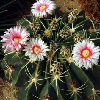 Ferocactus is a genus of large barrel-shaped cacti, mostly with large spines and small flowers. There are about 30 species included in the genus. This member of the Cactaceae family is found in the south-western United States and north-western Mexico. The young specimens are columnar but as they grow older ribs form and they take on a barrel form. Most of the species are solitary but some, such as Ferocactus robustus and Ferocactus glaucescens, form clumps. The flowers are pink, yellow, red or purple depending on the species, and the petals sometimes have a stripe of a darker colour. They are desert dwellers and can cope with some frost and intense heat. The typical habitat is hot and very arid, and the plants have adapted to exploit water movement to concentrate their biomass in areas where water is likely to be present. Like Sclerocactus, Ferocactus typically grow in areas where water flows irregularly or depressions where water can accumulate for short periods of time. They are most often found growing along arroyos (washes) where their seeds have been subjected to scarification due to water movement, but they oddly also tend to grow along ridges in spots where depressions have formed and can hold water for some period of time. Ferocactus have very shallow root systems and are easily uprooted during flash floods. The "fishhook" spines and the armoured web of spines enclosing the cactus body in many species of this genus are adaptations which allow the plant to move to more favourable locations. In cultivation Ferocactus require full sun, little water, and good drainage. They are popular as indoor houseplants providing they receive a few hours of sunlight a day. They are well suited for growing in pots and rockeries. Propagation is usually from seeds as most do not produce off-sets. Ferocactus macrodiscus originates from Mexico’s San Luis Potosi, Guanajuato, Oaxaca, Puebla and Queretaro de Arteaga regions. During drought periods the plants sink well into the ground from the effects of heat and dryness. For this reason it is very difficult to locate the cactus until the rains arrive and it swells itself and prepares to bloom. In the wild, if it is not flowering, it would be difficult to see it at all, however in cultivation with regular irrigation during spring and early summer it will stay above ground.