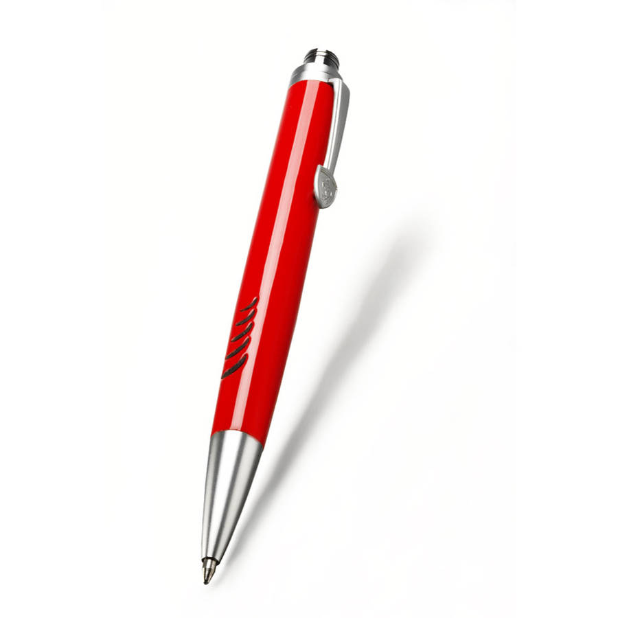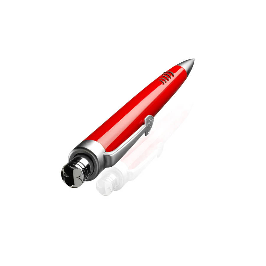 • Red enamelled aluminium ballpoint pen with brass clip and button.
