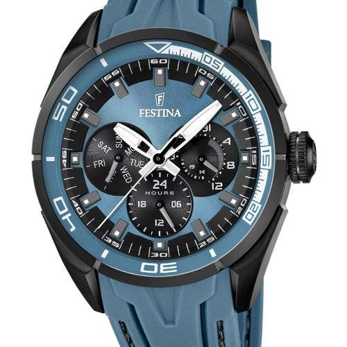 Case- Case Material: Stainless Steel (brushed/polished)- Case Shape: Round- Bezel made of: Stainless Steel (polished)- Crystal: Mineral crystal- Case Colour: Black- Bezel Function: -- Back: Stainless steel back Movement- Calendar: Weekday + Date- Complications: 3 (Date; Day;24h)- Display Type: Hours; Minutes; Seconds & Weekday; 24h Indication- Movement: Quartz - Dial : Smooth- Illuminated: fluorescent (green)- Dial Colour: Blue Strap- Strap Colour: Blue- Clasp: Buckle clasp- Strap Material: Caouchouc Further Details- Product: Watch- Hersteller: Festina- Model: Sport- Special Feature: very sporty- Logo on: Dial; Crown; Clasp; Back; Strap- Guarantee: 2 Years Manufacturer's Guarantee- Packaging: Original Packaging with Documents Technical Details- Distance between lugs in mm/inches: 52 / 2.05- Width of the Strap in mm/Inches: 22 / 0.87- Diameter (without crown) in mm/inches: 44 / 1.73- Weight in g/ounces: 85 / 3- Height in mm/inches: 12 / 0.47- Maximal Strap Circumference in mm/inches: 205 / 8.07- Water-restistant (m/bar): 50 / 5