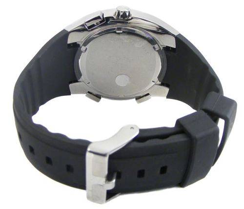 The three digital windows for chronograph, alarm, calendar and world time functions are equipped with an electro-luminescent backlight that illuminates the digits only, ensuring easy viewing in dark conditions. The white hands show off well against the red dial with its luminous hour markers. The case is solid stainless steel in a brushed and polished finish and the case back is the screw in type, ensuring a water resistance of 100m/10bar. A convex mineral crystal glass ensures good resistance against those everyday nicks and scratches.