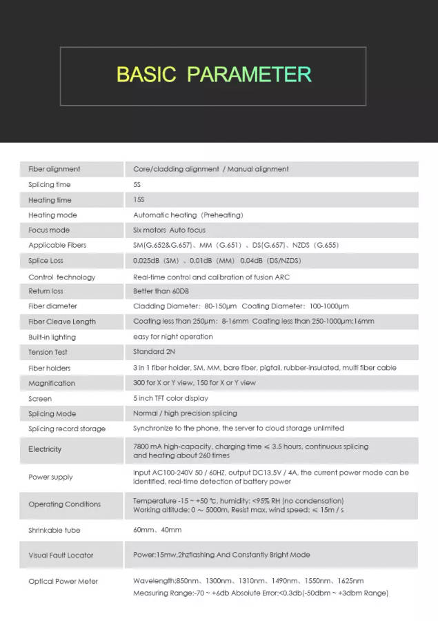 The machine uses an industrial quad-core CPU, fast response and is currently one of the fastest fiber splicing machine in the market. It includes a 5-inch 800 x 480 resolution screen, operation is simple and intuitively navigated via the menu; and up to 300 times focus magnifications to check the fiber cores clearly.