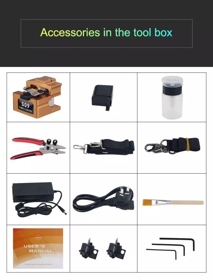 The AI-9 Splicing Machine use the latest fiber core alignment technology with auto focus and six motors, it is a new generation of fiber fusion splicers. It is fully qualified for trunk construction of medium and short distances fiber, FTTH projects, security monitoring and other fiber cable splicing projects.