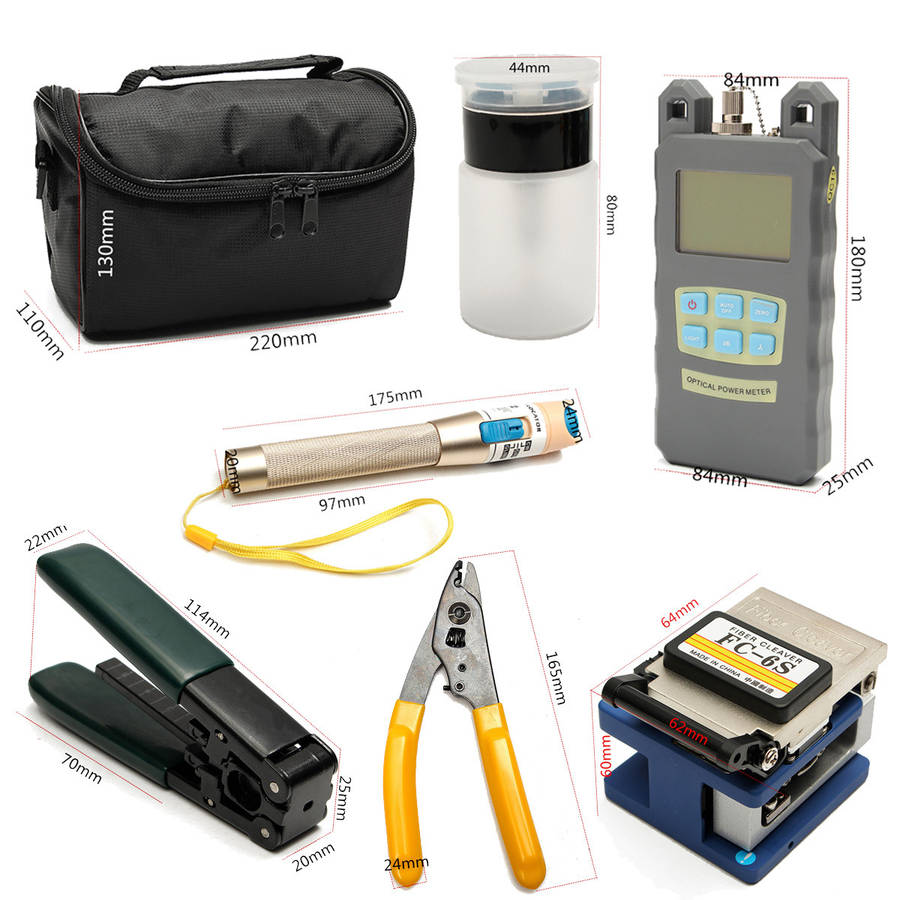 1 x Toolkit with Detachable straps 1 x Optical fiber red light test pen 1 x CFS-2 Duplex optical fiber coating layer stripping pliers 1 x Leather line cable stripping machine 1 x High precision FC 6S cutter 1 x High precision optical power meter 1 x Optical fiber fixed length unit (In order to convenient transportation, we don't provide the battery)