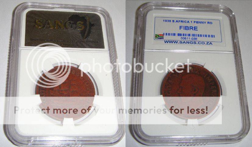 FIBRE 1938 Penny (1d) holed : Union of South Africa : Sangs authenticated
