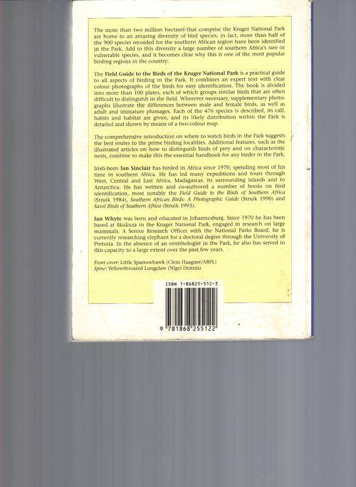 Field Guide to the Birds of the Kruger National Park, by Ian Sinclair & Ian Whyte, Publ. Struik 1991, soft cover, illustrated with more than 570 photos, 251 pages, good condtion.