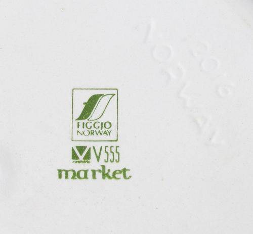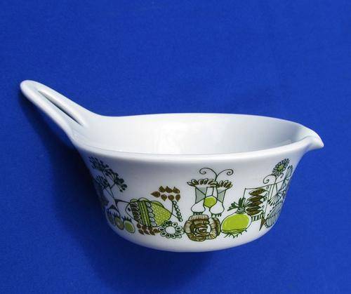 This Sauce/Gravy Boat is in the iconic "Market" design by the artist Turi Gramstad Oliver for Figgjo Flint (F/F) Norway around 1963. This sought after retro piece features whimsical Scandinavian market scenes.