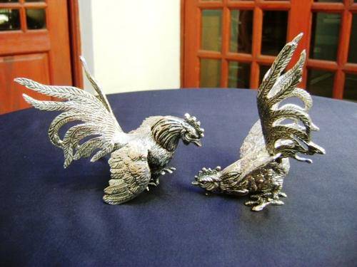 FIGHTING COCKS SILVER PLATE ON COPPER PAIR