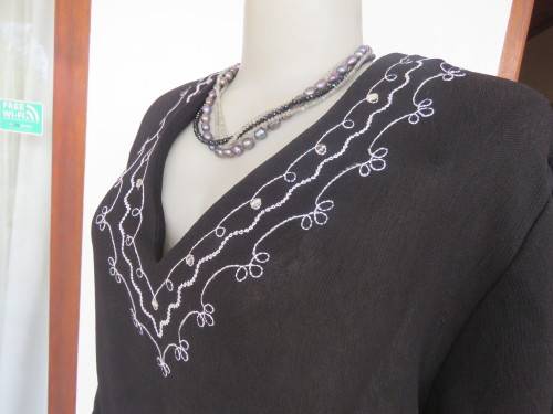 Figure friendly black 'DONNA-CLAIRE' size 46/22 slip over top.In 100% polyester fabric.V-neck with white embroidery all around.Long short sleeves repeating same white embroidery around seams with slitted sides.Used but in good cond.