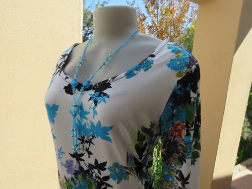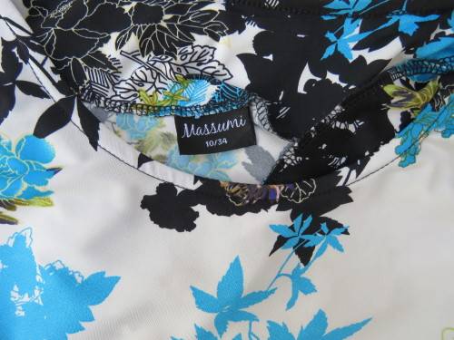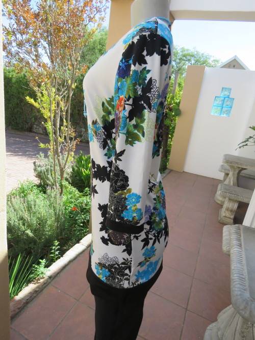 Figure friendly long stretch polyester top with bracelet length sleeves by 'MASSUMI' in 34/10.Beautiful colourful pattern on white background.Very attractive with black band around seam and cuffs.Rounded neckline.As new