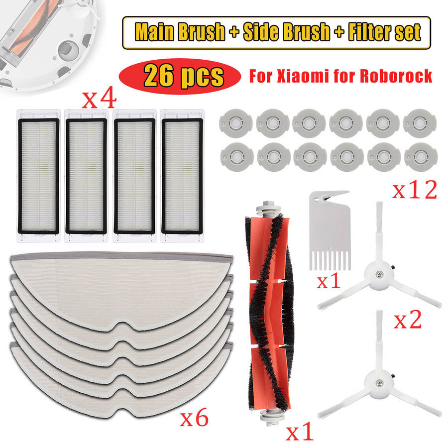 Specification: Material:ABS Size: as pictures show QTY: 26 Pcs/Set - Main Brushes Floating structure, deep cleaning Nylon brush, it will not scratch the floor Detachable design, easy to clean - Side Brushes Nylon brush, it will not scratch floor and furniture. Unique design, easy to collect hair. - Filter Washable design - Mop Cloths For easy cleaning Features: - 26 PCS Filter Side Brush Main Brush Parts ,meet your different need; - High quality accessory kit for replacement,durable in use; - Suitable For Xiaomi for Roborock Robot S50 S51 S55 Vacuum Cleaner.