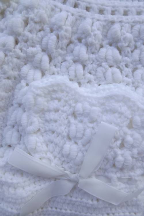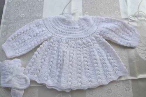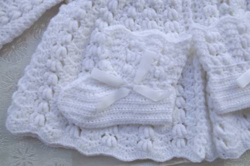 Finely detailed white acrylic wool hand crochet matinee baby jacket with booties.Beautifully done.
