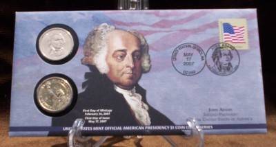 A U.S. Mint first day cover for the 2007 John Adams Presidential Dollar Coin. The Cover includes two coins with the P and D mintmarks, as well as a first class stamp postmarked May 17 2007, Quincy, MA.