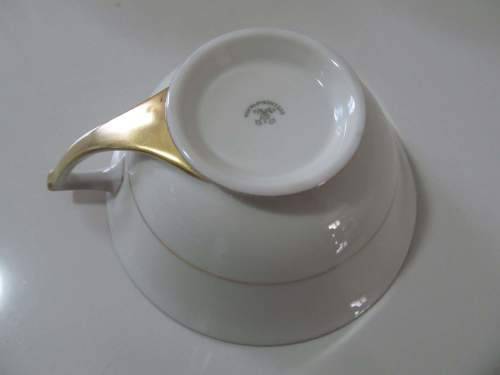 THIS LOT CONSISTS OF THREE IDENTICAL FINE PORCELAIN TEACUPS, EACH MANUFACTURED BY FISCHER & MIEG AROUND 1918 - 1920's, AND DESIGNED IN AN ART DECO STYLE. EACH TEACUP IS A CRISP WHITE WITH PROMINENT GOLD TRIM AND A GOLD BAND AROUND THE BODY. GOLD HAS BEEN USED DISTINCTIVELY UPON THE ITEMS HANDLES