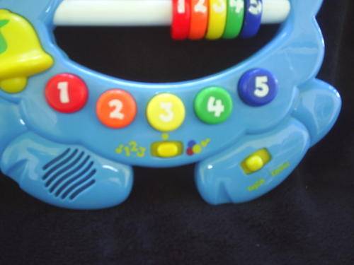 "The sheep’s orange nose lights up whenever it makes a sound. You can also push it; it alternates between bleating and a sweet giggle. The bell on the sheep’s neck is the largest button and the easiest to push. When pushed the bell plays either “Mary Had A Little Lamb” or “Baa Baa Black Sheep”. These two features work the same in either number or color mode, the rest of the features have work differently in each mode. The discs on the bottom bar in the middle slide back and forth. If you slide the discs one at a time a pleasant voice will state the number or color, depending which mode you are in. The buttons do the same thing when they are pressed, again either stating their color or number."