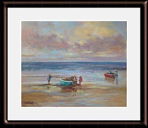 Late afternoon fisherman bringing in the catch. Unframed, but can be framed by buyer. 45,5 x 56cm on stretch canvass.