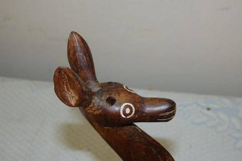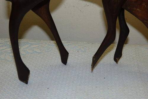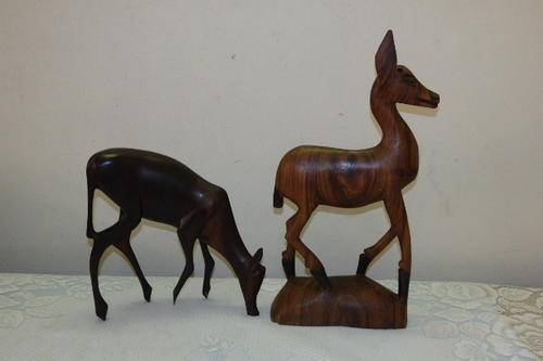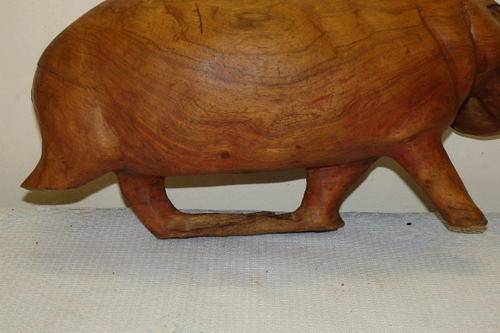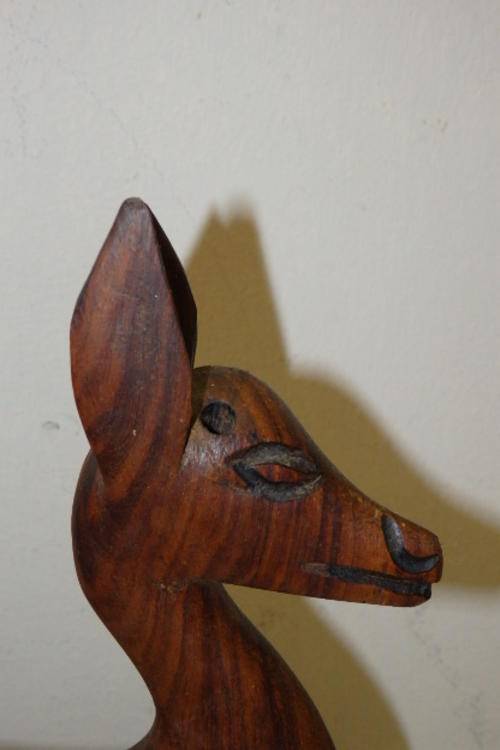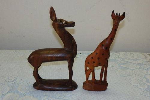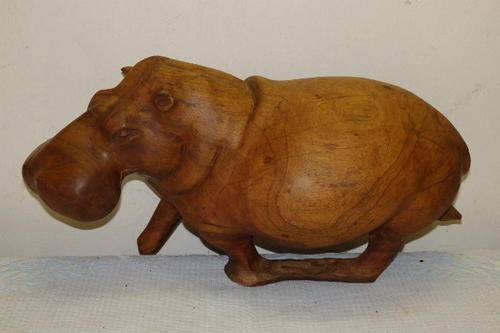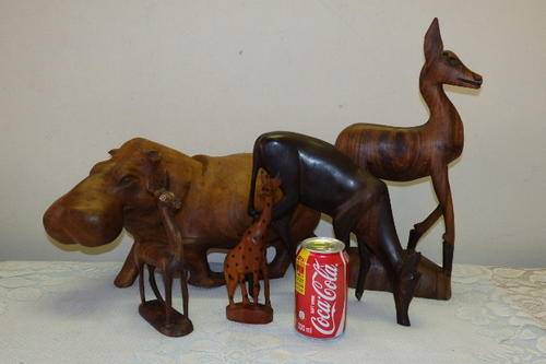 THIS COLLECTION FIVE ASSORTED HAND CARVED WOODEN AFRICAN ANIMALS INCLUDE BUCK, A HIPPO AND A GIRAFFE. THE PIECES HAVE WEAR AND TEAR AND WOULD BE IDEAL AS GARDEN ORNAMENTS WHERE THEY CAN BE SECURED IN SOIL ETC. PLEASE VIEW THE PICS CAREFULLY FOR THE GENERAL CONDITION OF THE FIGURINES. THE HIPPO IS A HEAVY PIECE.