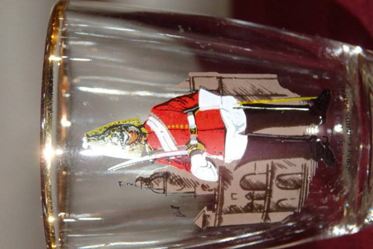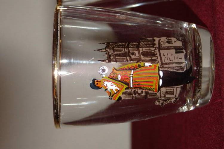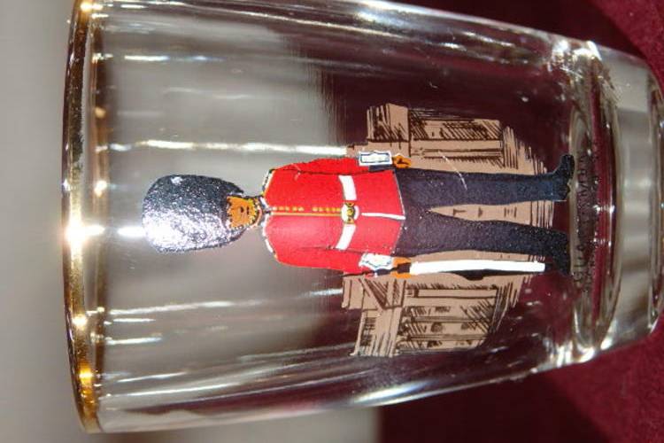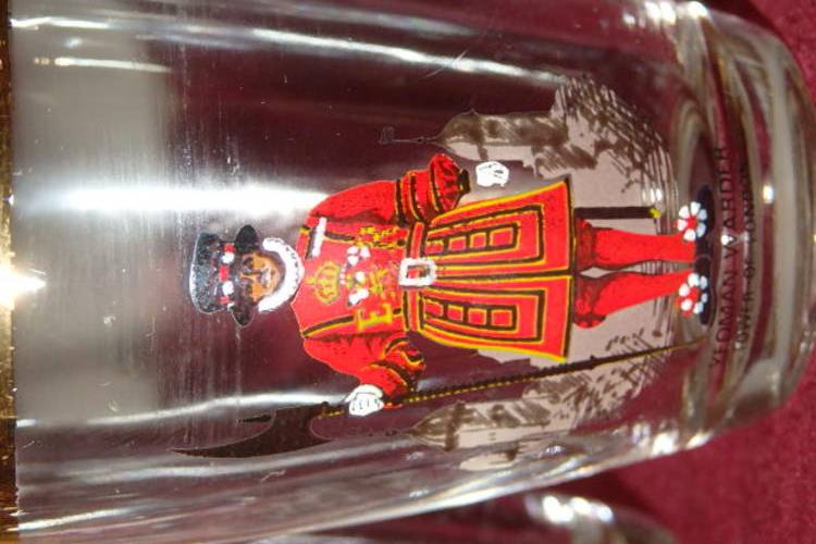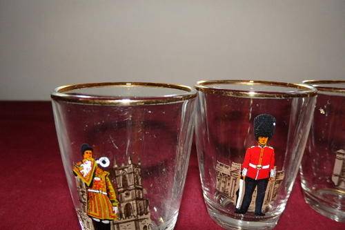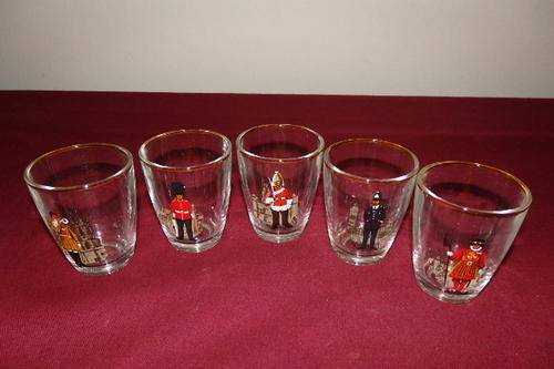 THESE FIVE FANTASTIC GLASS COLLECTABLE "BRITISH" THEMED DOUBLE TOT/ SHOT GLASSES ARE IN MINT CONDITION AND CONSIST OF THE FOLLOWING CHARACTERS: