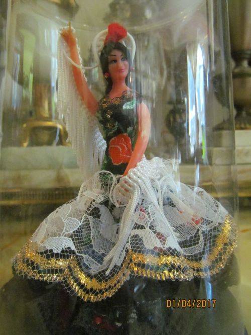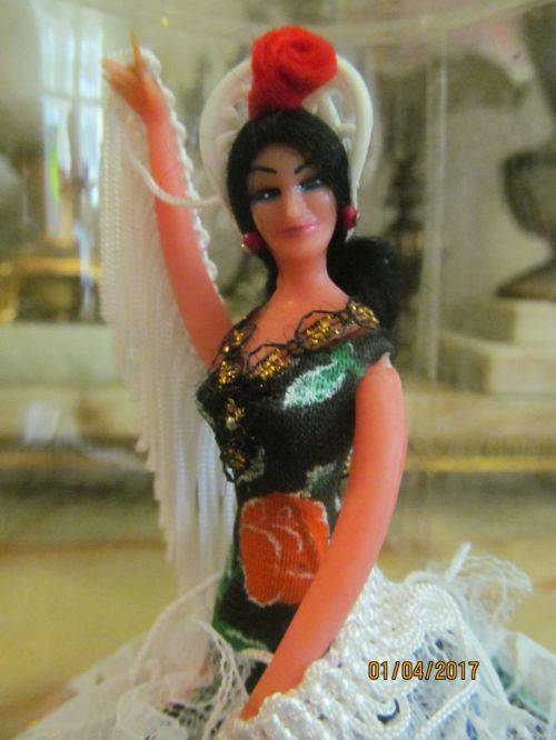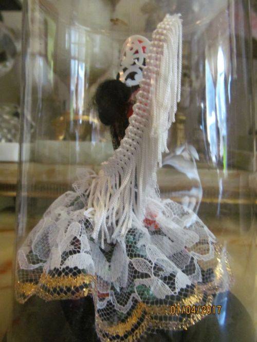 A VINTAGE ITEM THAT IS IN BRAND NEW CONDITION. THE DOLL/FIGURINE HAS NEVER BEEN REMOVED FROM ITS TRANSPARENT PLASTIC DISPLAY CASE SINCE THE CASE ITSELF IS STILL SEALED TO THE BLACK PLASTIC CIRCULAR BASE. A SPANISH FLAMENCO DANCER CLOTHED IN THE CUSTOMARY STYLE WITH A FLOWING BLACK DRESS WHICH HAS EMBROIDERED FLORAL PATTERNS UNDER A WHITE LACE WITH GOLD HEM. THE DANCER IS HOLDING A WHITE SHAWL WITH TASSLES AND HAS A DAINTY BONNET UPON HER HEAD.