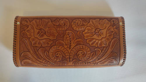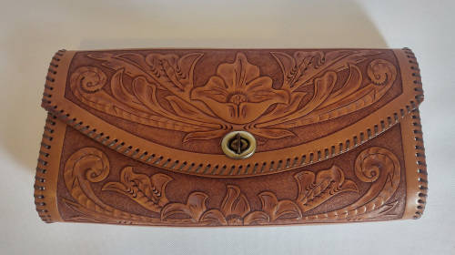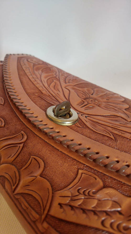 Vintage Genuine Leather clutch. Beautifully tooled with a flower pattern providing a raised relief texture.